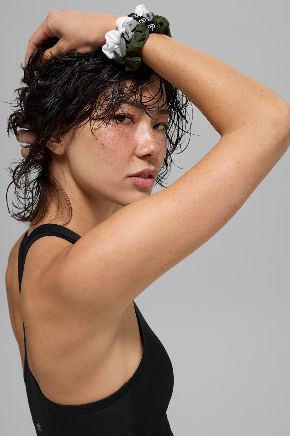 Mini but mighty. these statement scrunchies help you stay focused and fashionable. Designed in our fave Airlift fabric and colors to match from head to toe. The ALO graphic detailing makes them perfect to work from studio to street.